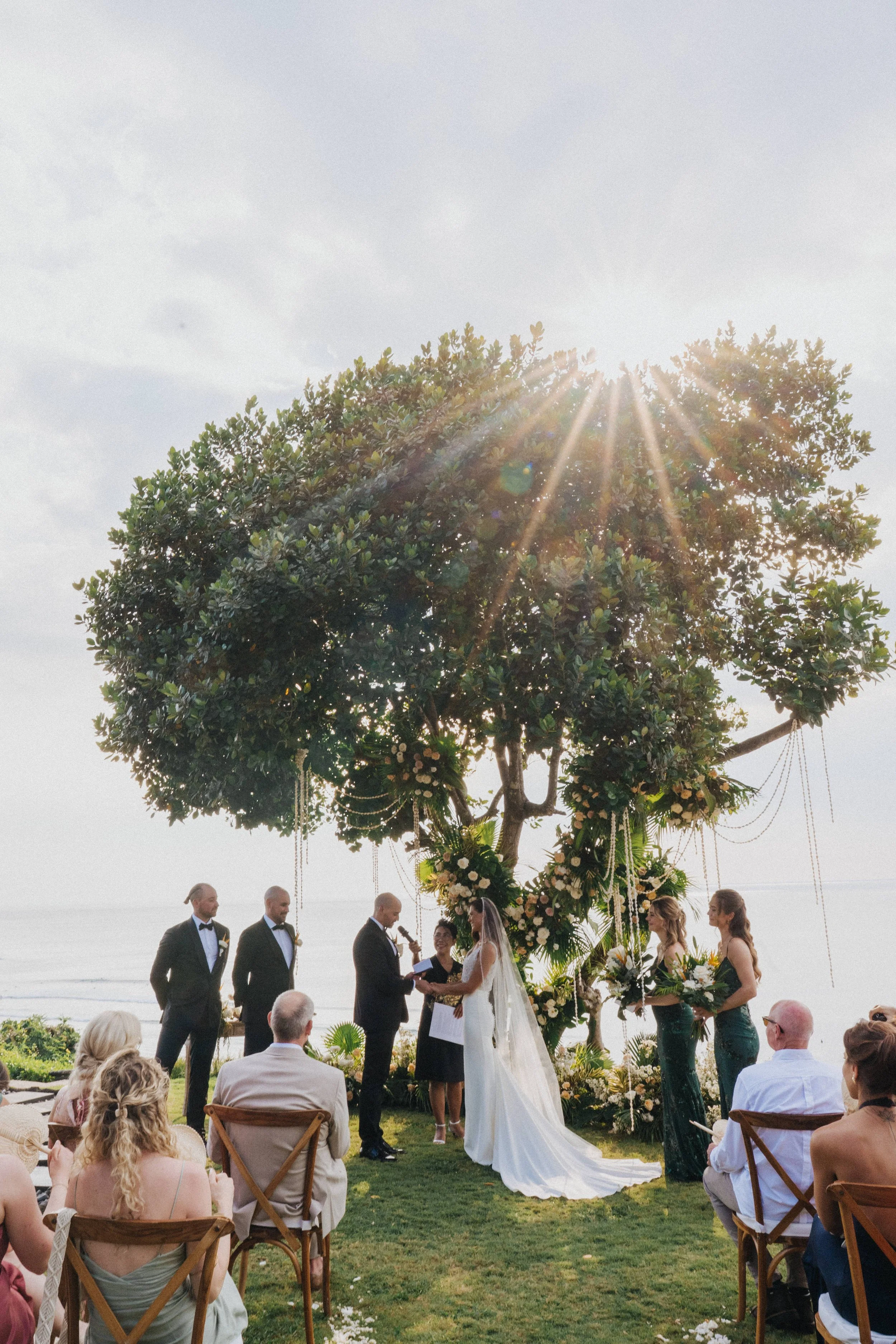 Our wedding was set on a clifftop in Uluwatu, Bali, overlooking one of the world’s most iconic surf breaks — a truly breathtaking backdrop. We leaned into a tropical-glam aesthetic: lush greenery, crisp white drapery and chandeliers created a magical and timeless dinner setting. The ceremony took place under a magnificent tree that felt like nature’s own arch, surrounded by a wild garden full of butterflies and birds.