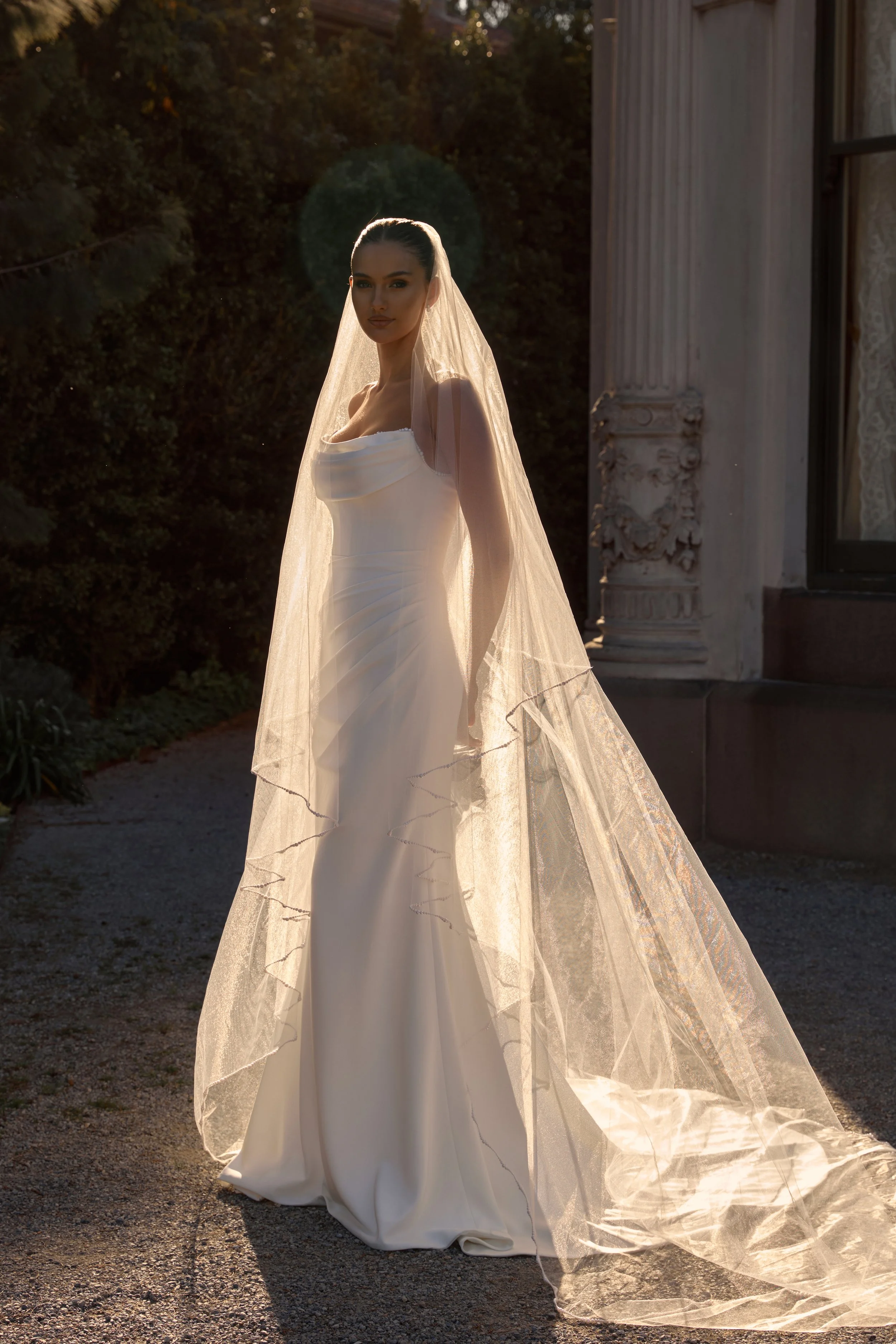 The Siren Cathedral Veil with Blusher, designed to echo the delicate pearl beading along the bodice neckline.