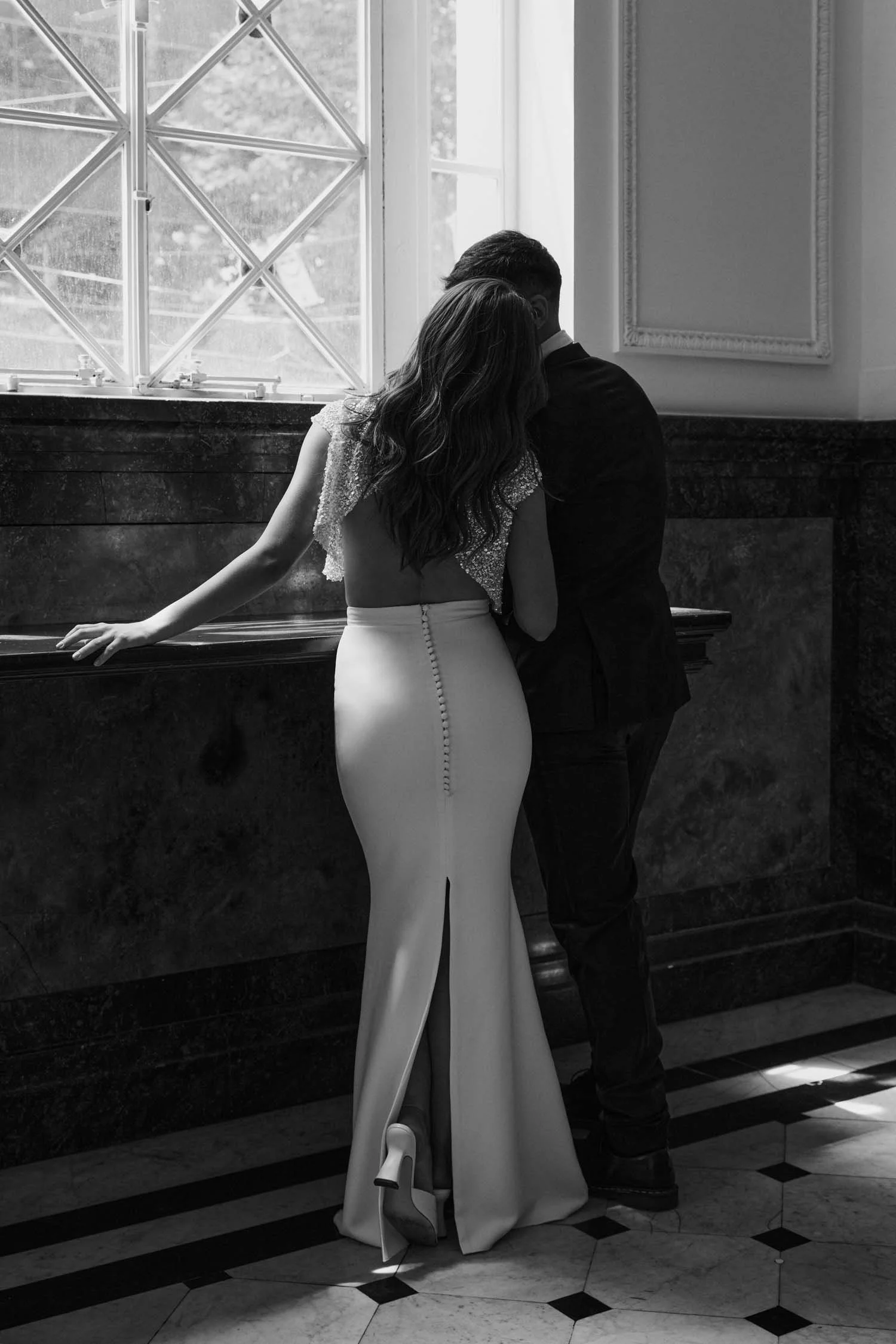 Simplicity meets sophistication in the Dominic Skirt. Crafted from luxurious, form-fitting ivory crepe, the Dominic is designed without a train, offering a clean, understated silhouette for the modern minimalist bride. Its sleek design enhances your natural curves while ensuring all-day comfort and effortless elegance.