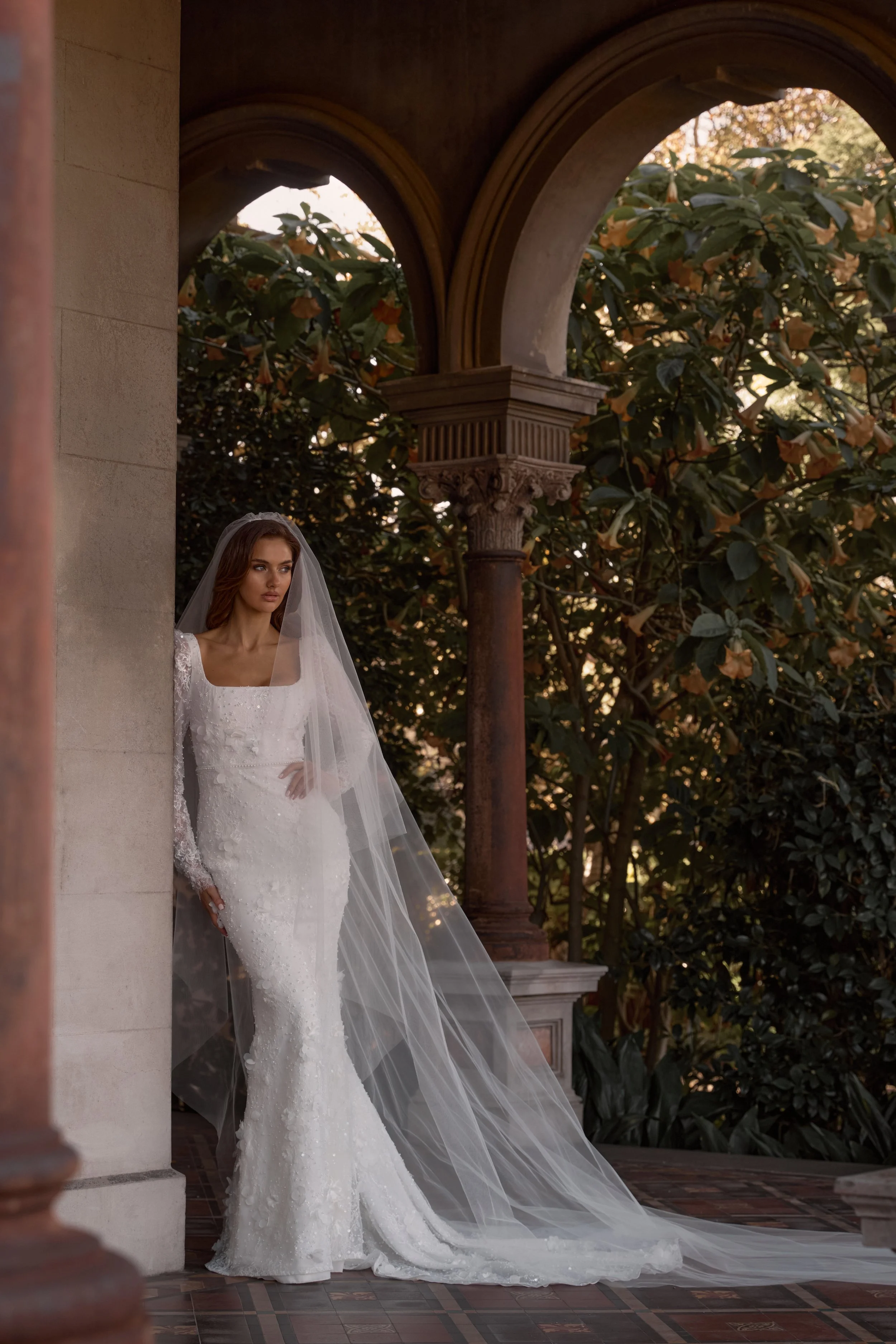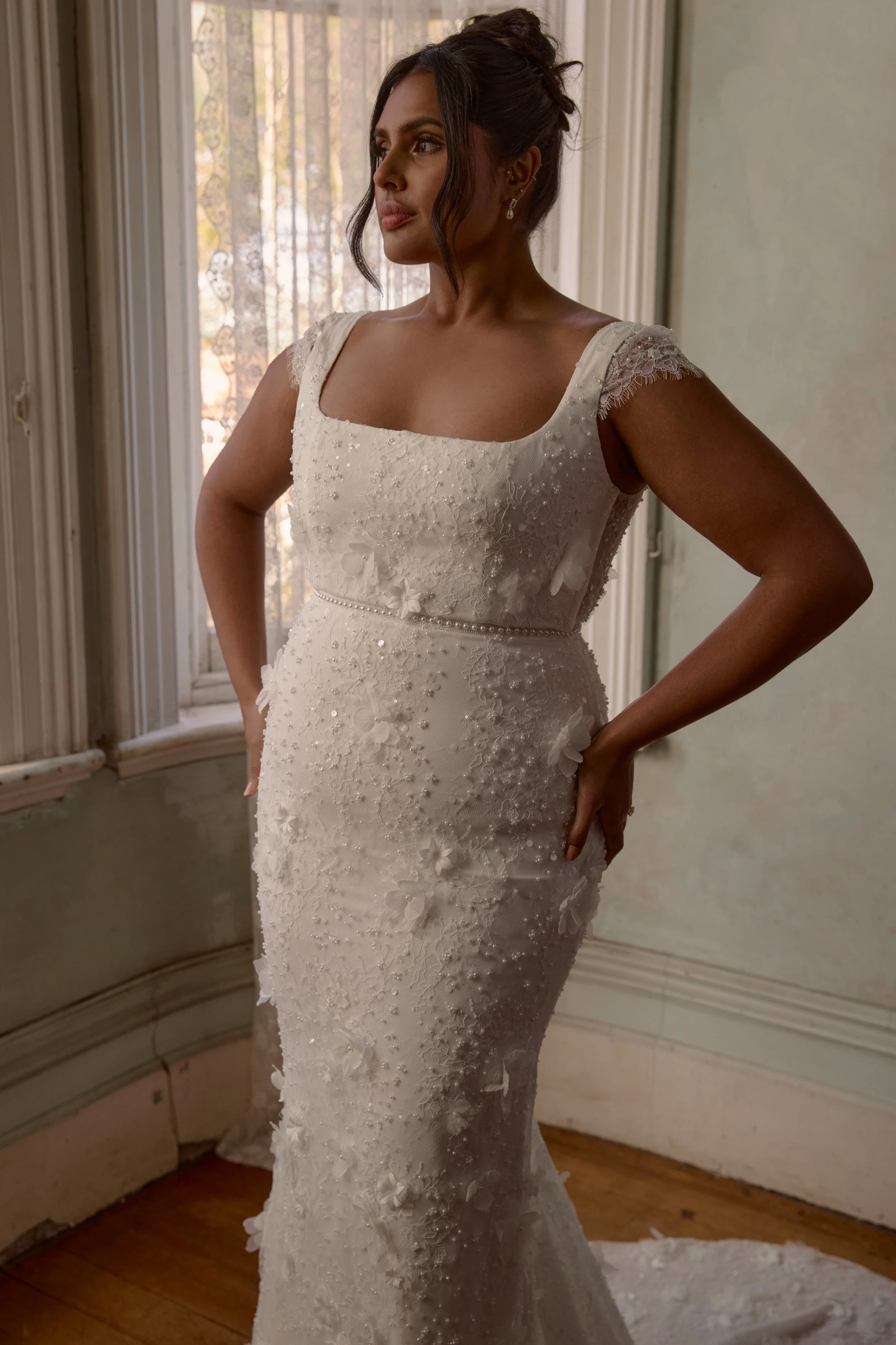 James blends vintage charm with modern elegance—featuring delicate beaded lace with pearl accents, and hand-embellished 3D florals. A contoured silhouette and square neckline bring timeless romance into the now.
